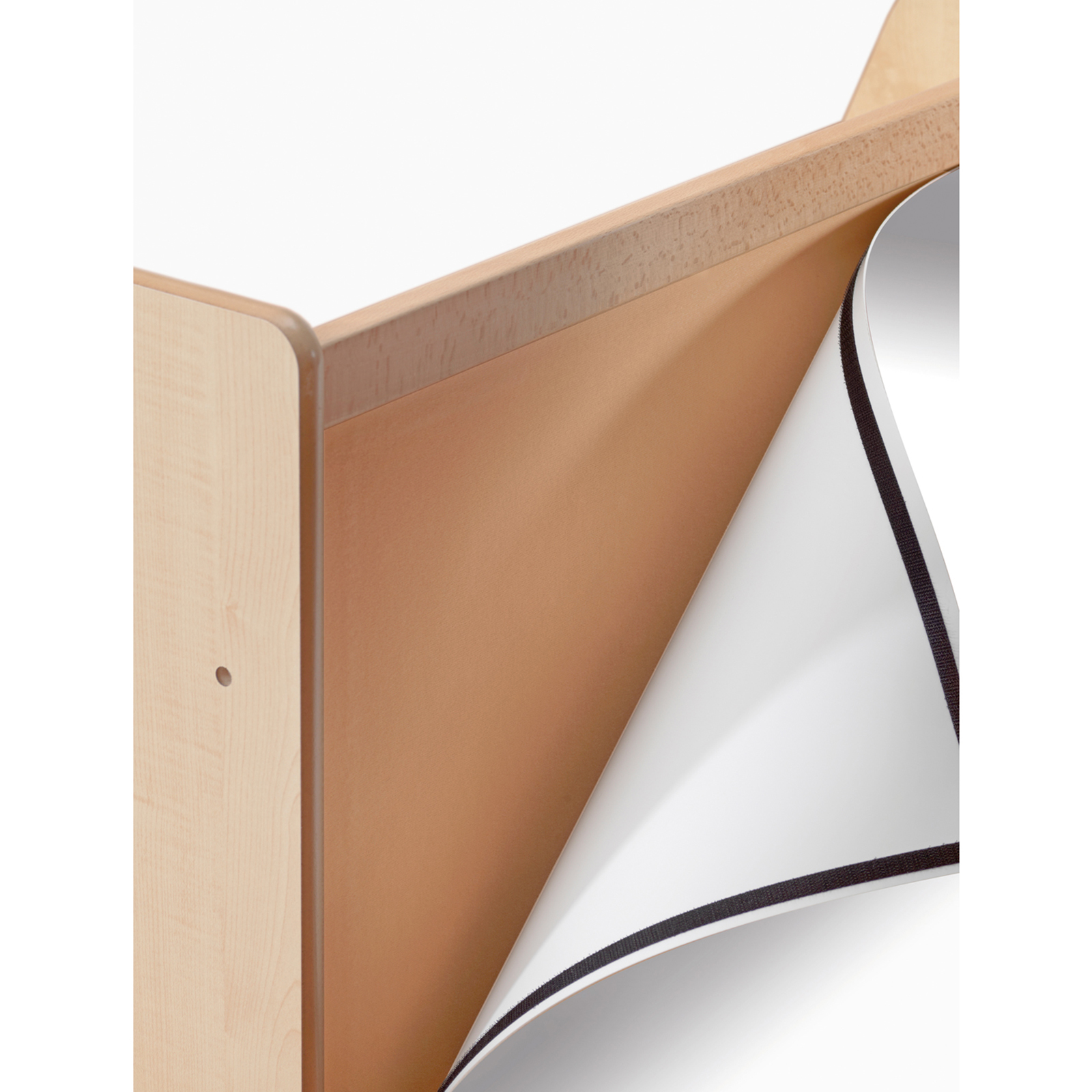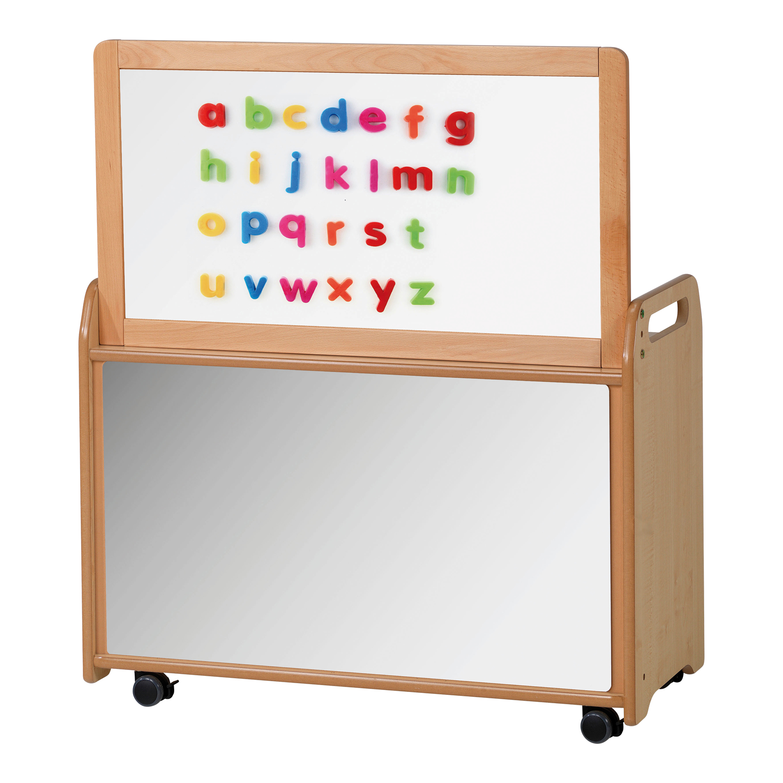 This mobile storage unit is accompanied by a removable double sided magnetic whiteboard.