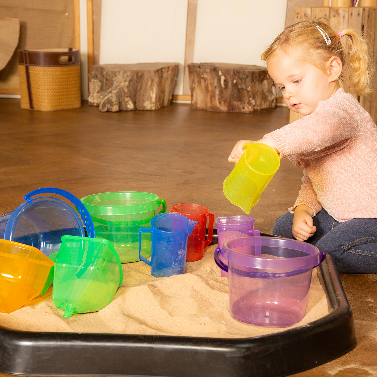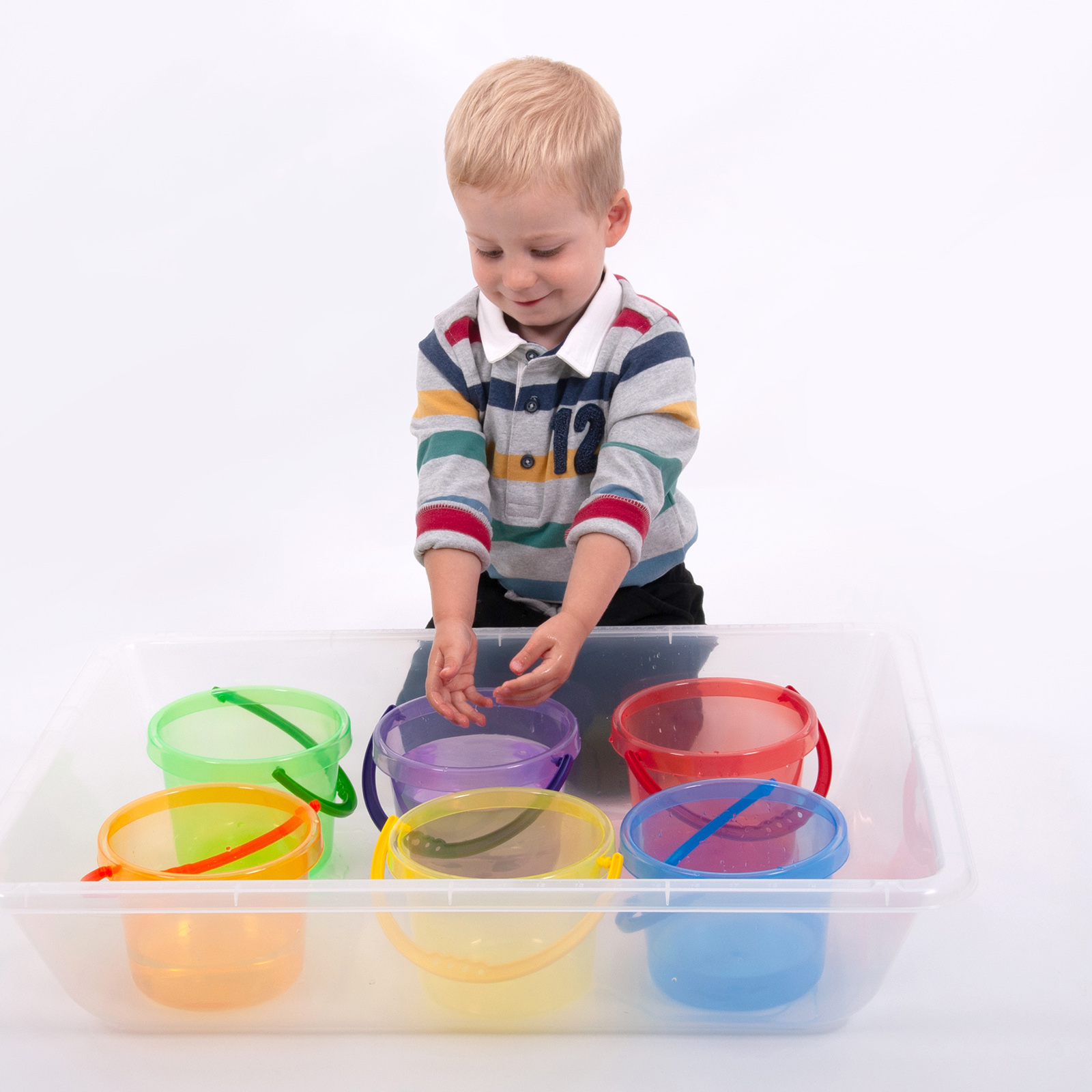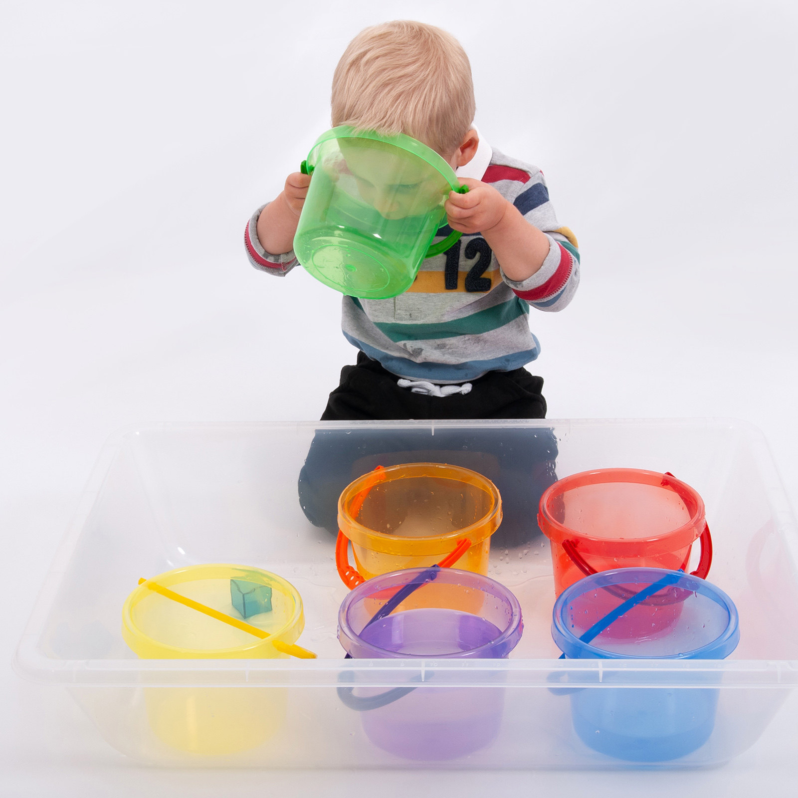 Fun stackable colour buckets, the perfect size for children to use in explorative play with sand and water, or for colour mixing and matching.