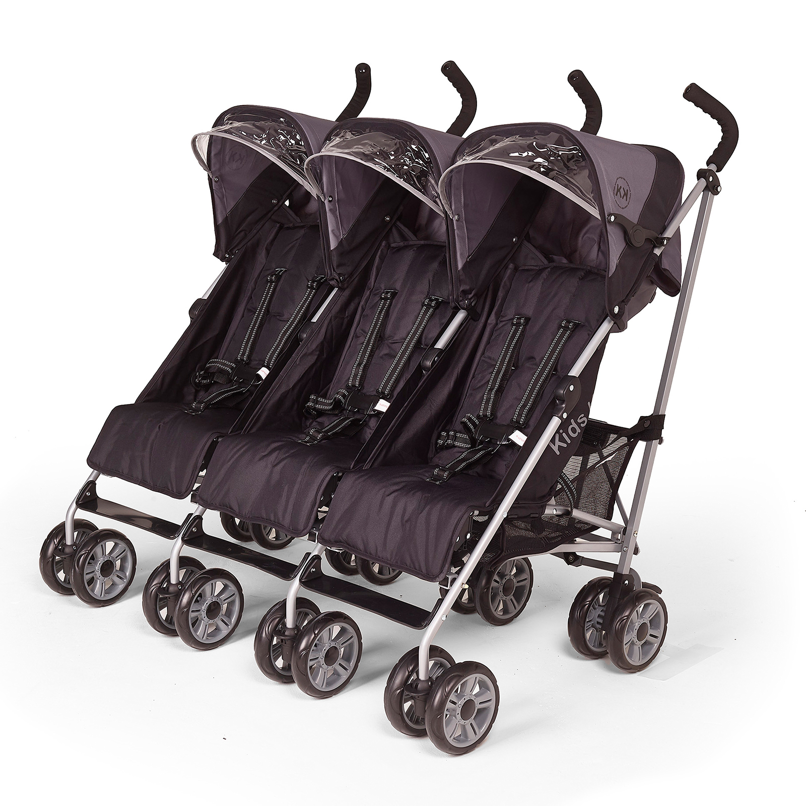 This triple pushchair is suitable from birth and can accommodate three children in a side by side position.