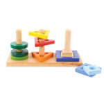 A simple manipulative puzzle featuring a set of 9 shapes which must be twisted and turned to slide on to the sturdy wooden pegs.
