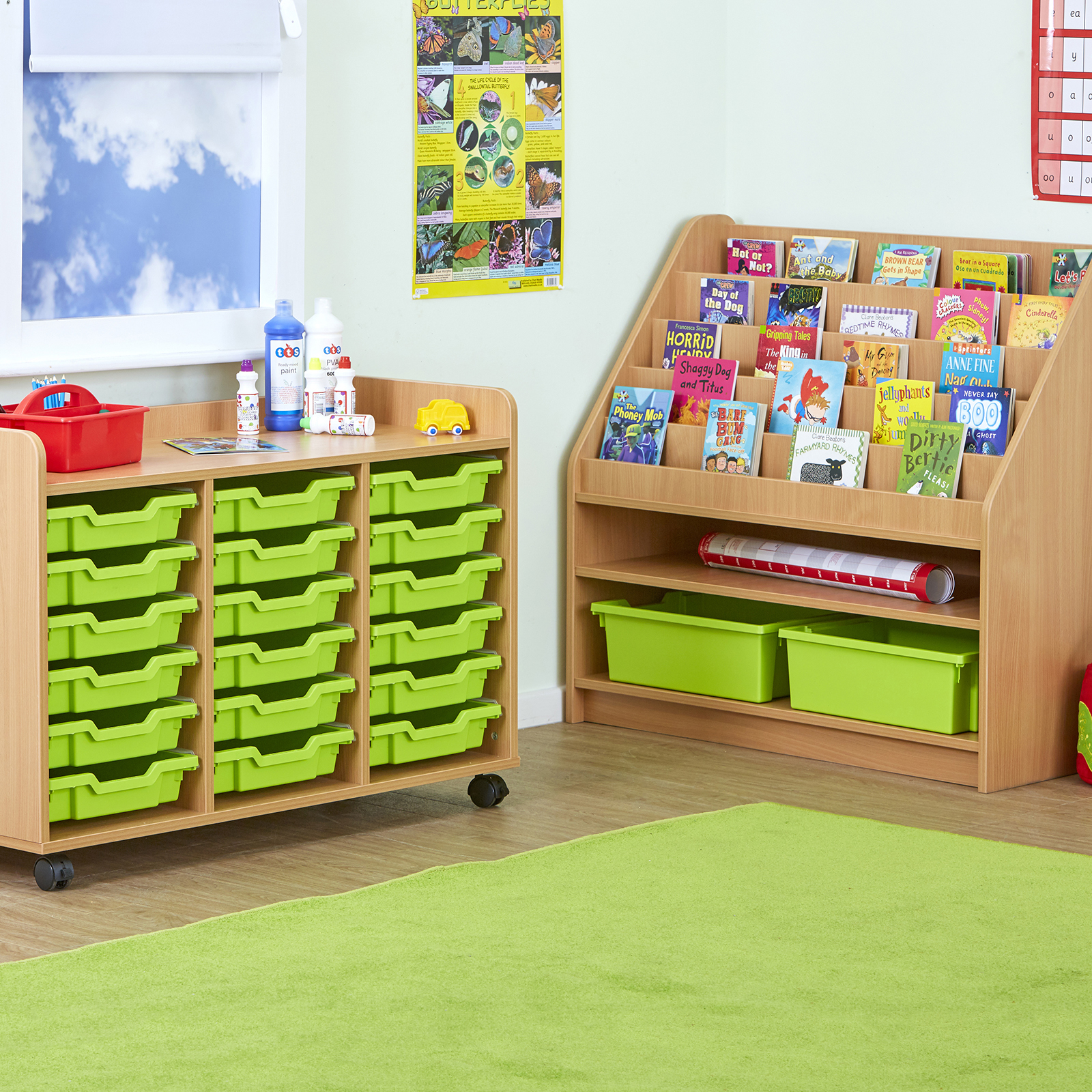• Includes an 18 shallow tray unit with trays, tiered front facing book storage unit with two deep trays, and easy access bookcase with three shelves.