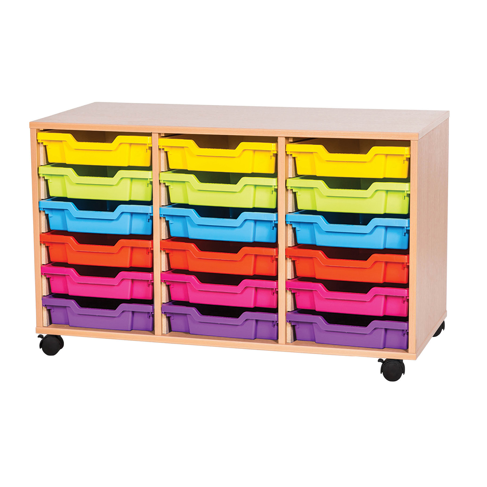 This tray storage unit can store up to 18 plastic storage trays across its three columns.