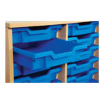 This tray storage unit can store up to 18 plastic storage trays across its three columns.
