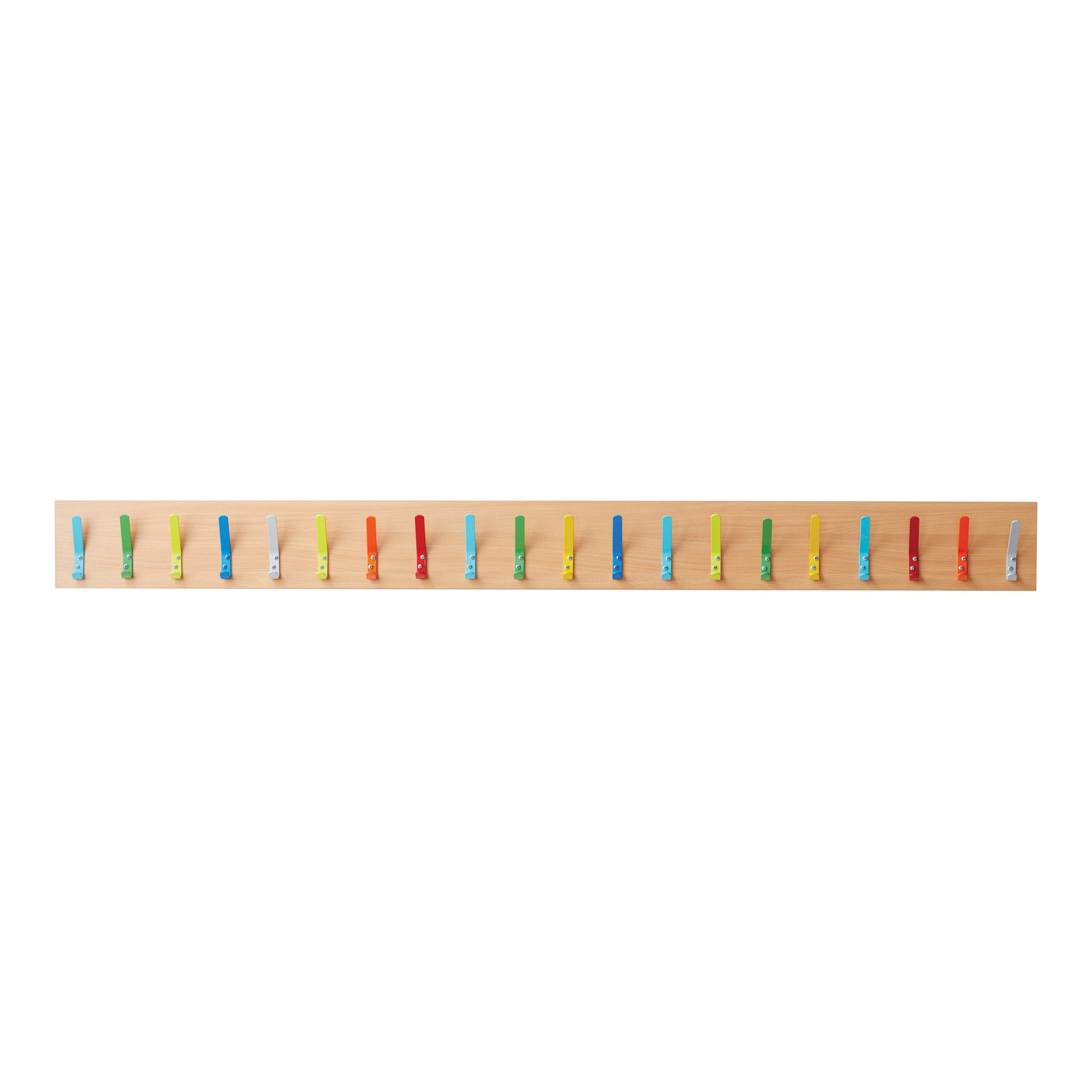 Colourful coat hooks mounted on a board suitable for any junior setting cloakroom.