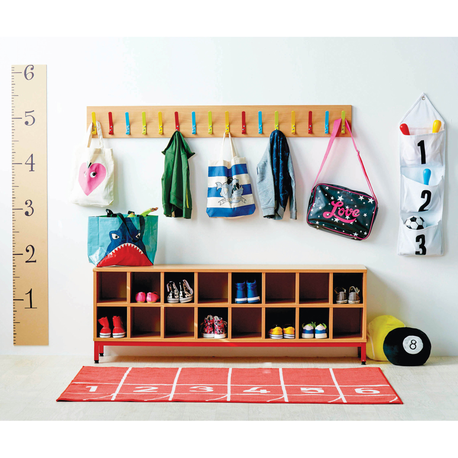 Colourful coat hooks mounted on a board suitable for any junior setting cloakroom.