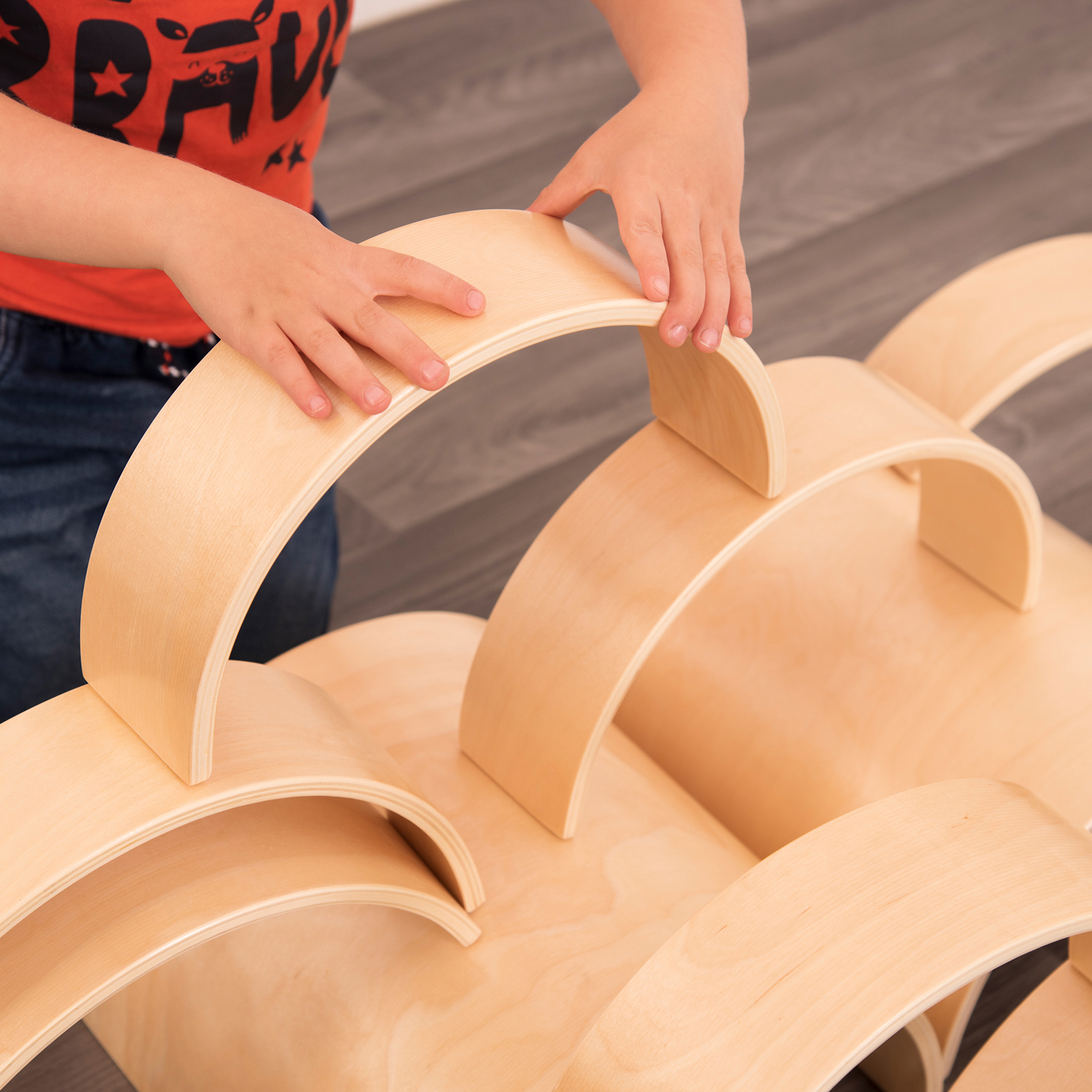 A set of wooden curved building blocks, that can be stacked together, or used on their own as part of other block sets to enhance play further.