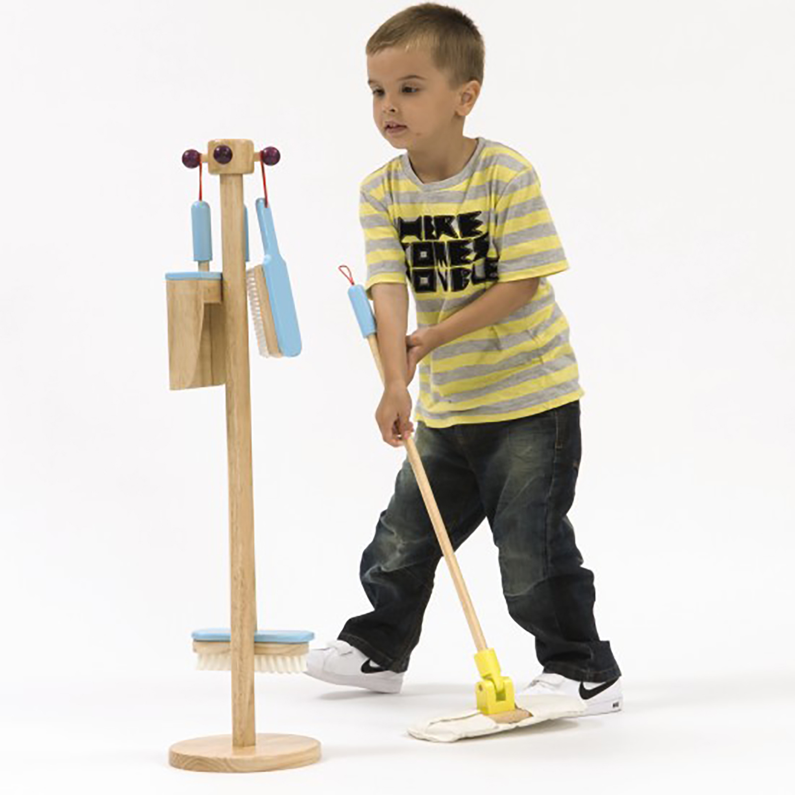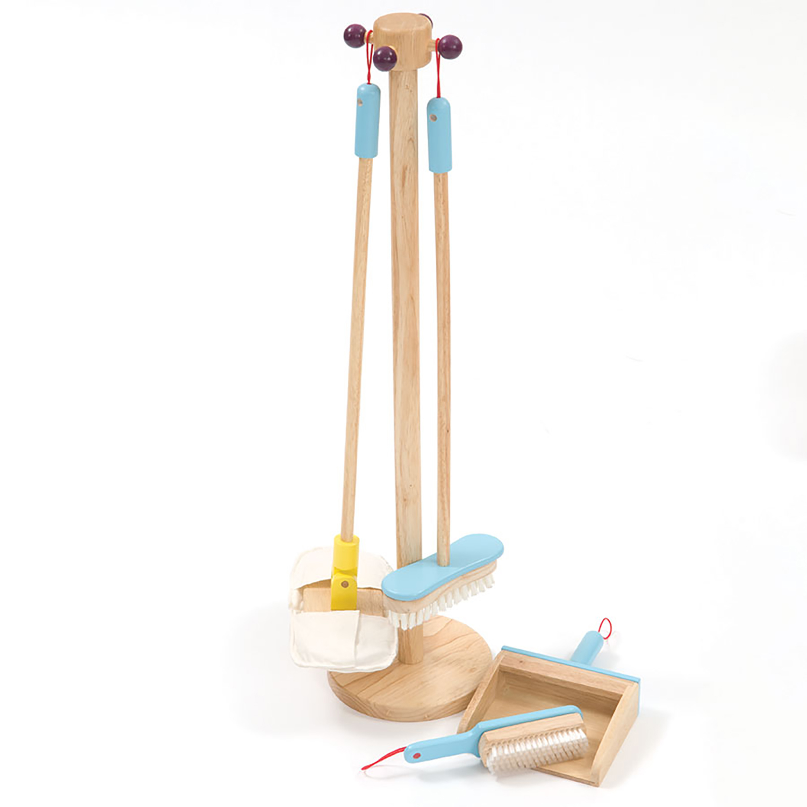 A four piece wooden cleaning set with its own stand.
