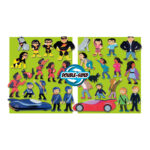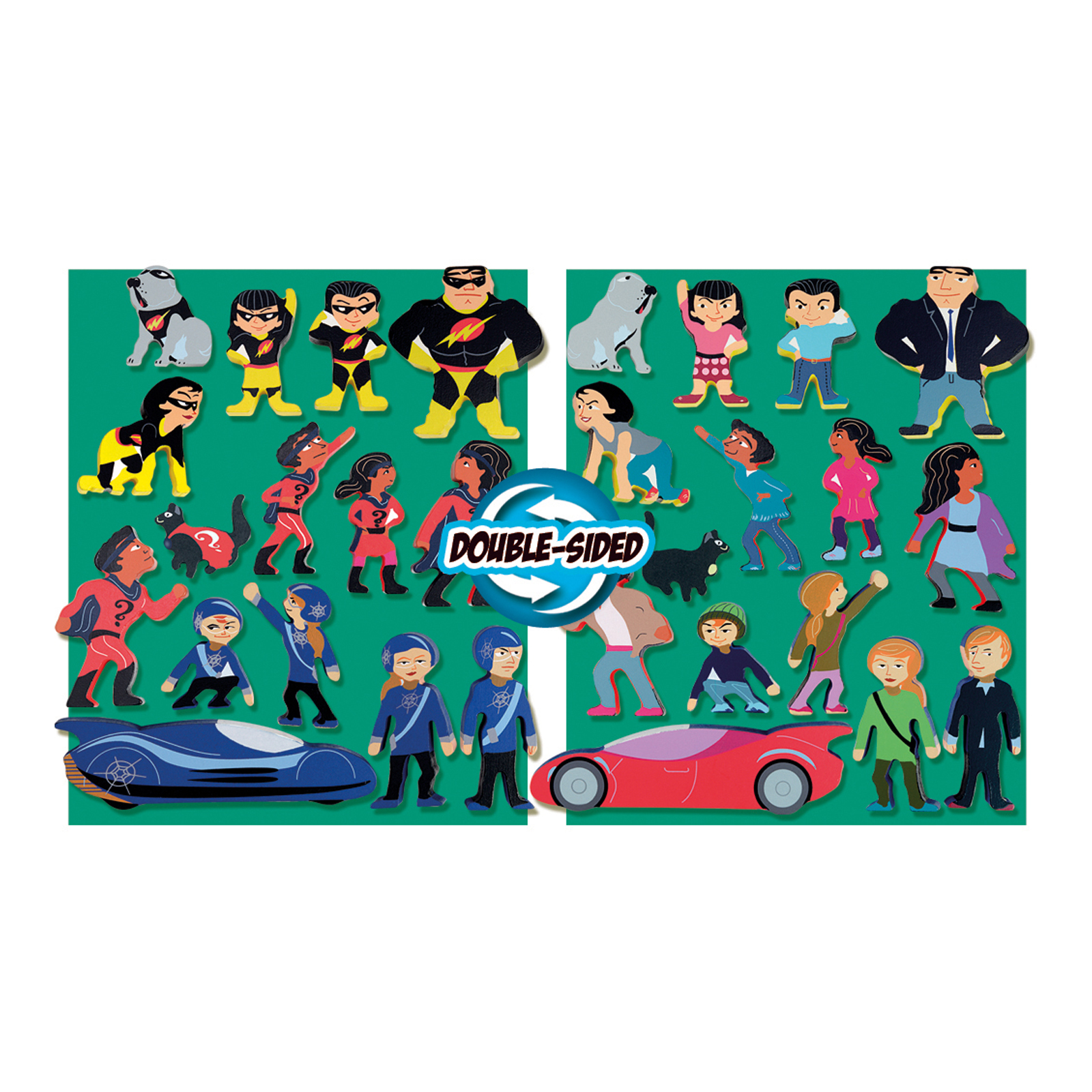 Turn the figures around to reveal their superhero side!