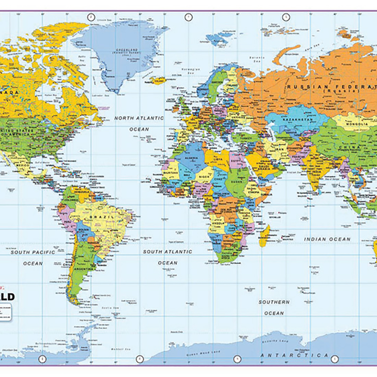 This detailed, political map of the world is printed onto hard wearing, scratch resistant vinyl with corner eyelets.